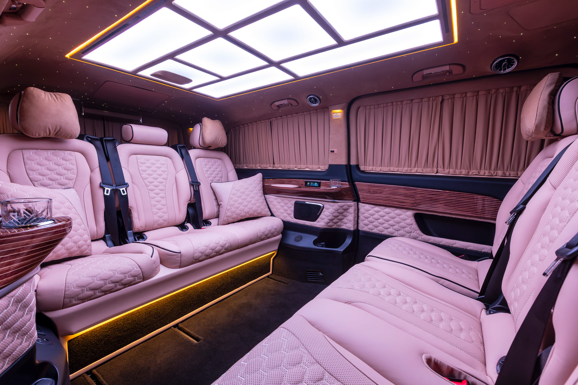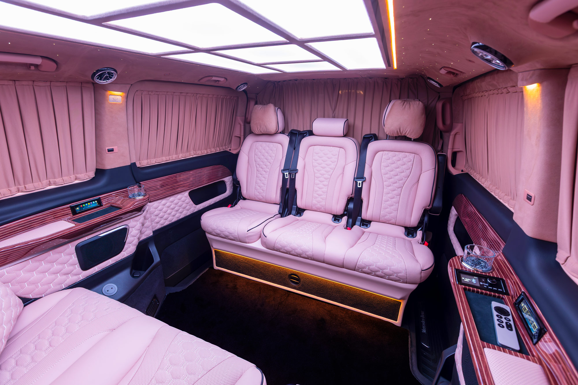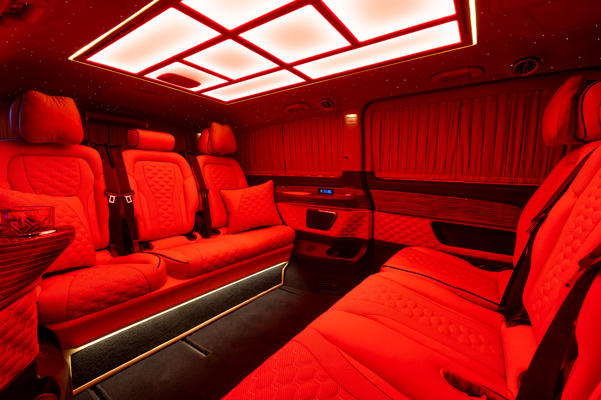 The interior features a Maybach-style LED ceiling with multi-color ambient lighting and dimming function, combined with an integrated ambient lighting system, creating an elegant and relaxing atmosphere at all times. Advanced thermal and acoustic insulation ensures outstanding climate comfort and superior noise reduction, perfectly isolating the VIP compartment from the outside world.